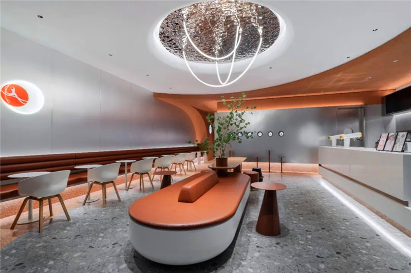 設(shè)計師受廬山云霧景象的啟發(fā),客座區(qū)的墻面選用了霧化鋁板作為背景,讓環(huán)境、時間與人的變化映入“云霧”之中??妥鶇^(qū)中心的水波紋圓池天花,在如流水的燈光映襯下像反轉(zhuǎn)的湖景。在不同的角度觀察,“湖水”倒影也呈現(xiàn)出不同的變化。