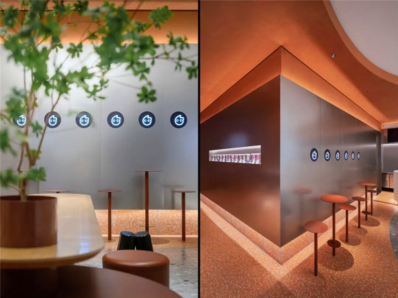 CoCo都可九江九方店位于商場室內(nèi),設(shè)計師首先提出去掉玻璃與門的店面形態(tài),得到了店主與商場方的認可,從而創(chuàng)造出客人更自由“流動”的門店格局??臻g的整體設(shè)計以CoCo品牌的精靈頭像特征為創(chuàng)作元素,設(shè)計師分別在天、地、墻劃出三道彼此相連的弧線,盤旋環(huán)繞著客坐區(qū)中心上方的水波紋圓池。創(chuàng)造出如置身于山林懷抱的空間形態(tài)。