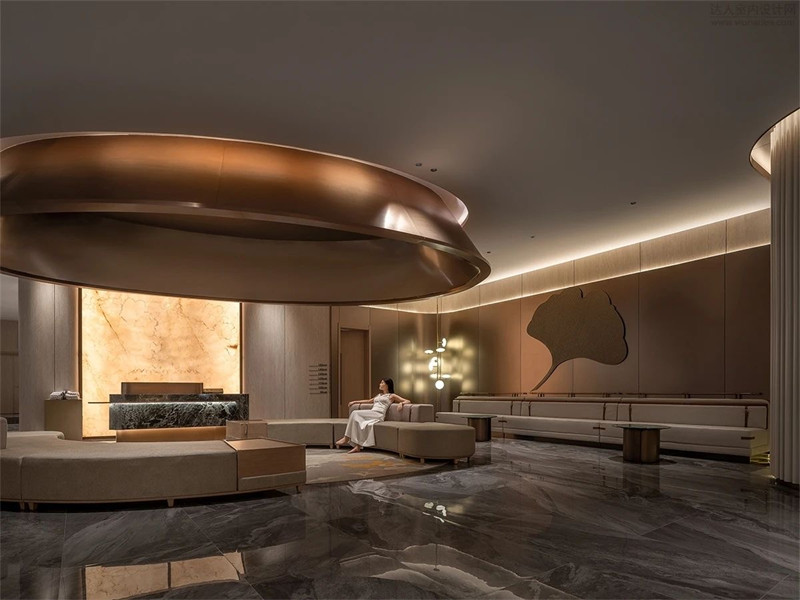 初入大堂,弧形天花將人們的視線鎖定,縱橫全局的金屬質(zhì)感,搭配銀杏元素獨(dú)有的色彩肌理,巧妙融入輕奢元素,材質(zhì)與色調(diào)交感呼應(yīng),沙發(fā)隨著頓感的弧形伸展開(kāi)來(lái),形成極強(qiáng)的包裹感,落座于此,即刻放松下來(lái)。