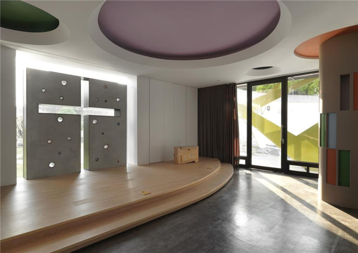 以水泥粉光作為十字型墻面的材質(zhì),當(dāng)光線穿透時(shí),十字型的光影便會(huì)投射在地上,不僅能成為視覺焦點(diǎn),如此設(shè)計(jì)更能為長(zhǎng)型格局的教室引入柔和的光線!