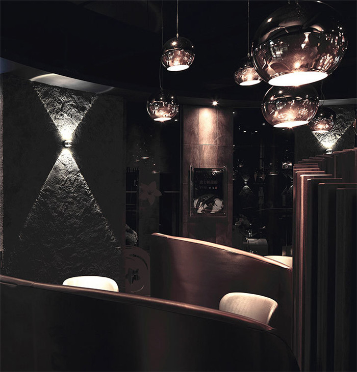 包廂外部則由虛實(shí)相間的格柵,篩過模糊分野后既私密又流動(dòng)的場(chǎng)域調(diào)性,制造出豐富層次下的視覺美感;而包廂內(nèi)則承襲銅花設(shè)計(jì)概念,間接光線與吊燈相互點(diǎn)綴的表現(xiàn)手法,將半圓金屬皮革座椅圍塑成花瓣綻放時(shí)緩慢蔓延之姿。