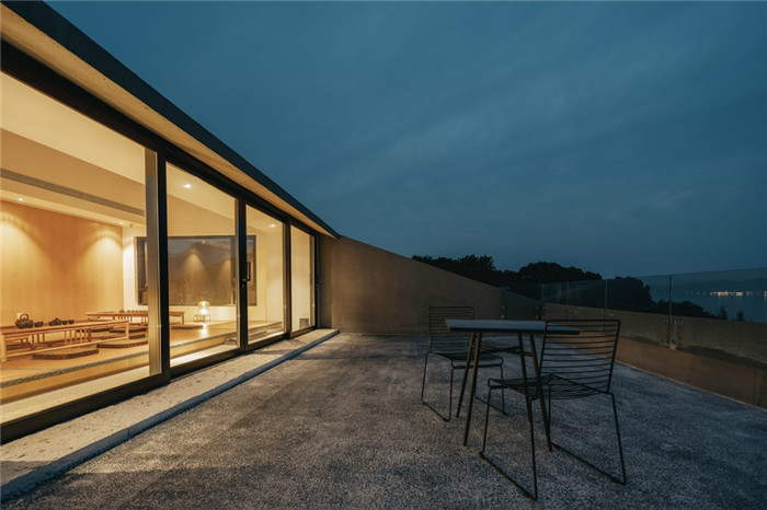 閣樓采用180毫米厚的現(xiàn)澆混凝土板,結合傾斜雙坡與水平面構成穩(wěn)定三角的力學特征,塑造了無梁的室內(nèi)空間以及內(nèi)外一致的板片屋面形態(tài),結構僅在柱位點接,這使屋面整體如同懸置于頂層空間之上,輕盈之余為景觀的納入提供了更多可能:北側面湖的坡面以橫向通長的開口塑造了一個嵌于坡中的露臺,借由這個開口,內(nèi)側空間以水平通長的低伏檐口限定出一幅面向太湖的平遠畫卷;東側屋面懸出墻外,山的輪廓借由自然形成的三角形開口納入空間之中,山水景致借坡入畫,用之于空間。