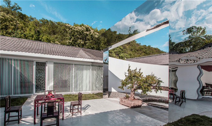 鏡面反射將真實物質世界投影到虛化印象中,設計將兩個不同形態(tài)的體量通過鏡面連接,一面是方形傳統(tǒng)坡屋頂建筑,另一面是極簡的白色半圓形圍墻,而中間的鏡面讓其體量形成了對稱式的延伸。讓建筑通過反射的投影達到自身的“完型”,時尚院落配以中式傳統(tǒng)桌椅仿佛是一場無聲的對話。
