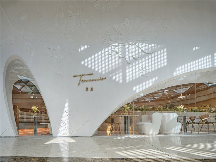 整個異化的構(gòu)造形態(tài)為人與空間建立了聯(lián)系,通過花瓣的形態(tài)建立了外立面的構(gòu)造關(guān)系,通過石膏雕塑放大了花藝形態(tài)融入其中,通過物體和人的動線在空間中巧妙的引到空間深處,使空間具有浪漫氛圍的同時,也能讓客人在建筑空間內(nèi)去感知自然變更所帶來的光影樂趣。