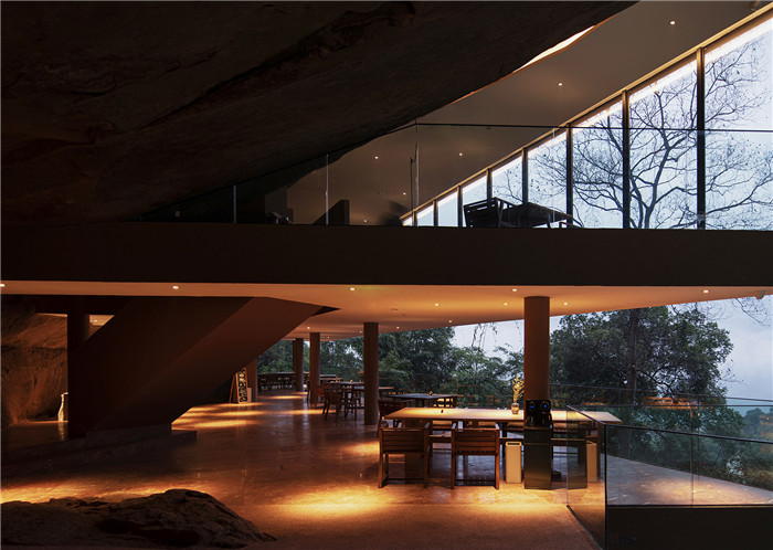 在泳池的上方是洞穴的第二條瀑布,瀑布營造獨特的就餐環(huán)境,潺潺流水,與泳池相呼應。餐廳的戶外平臺,人與水近距離接觸,聽著林澗鳥語,感受細水長流……