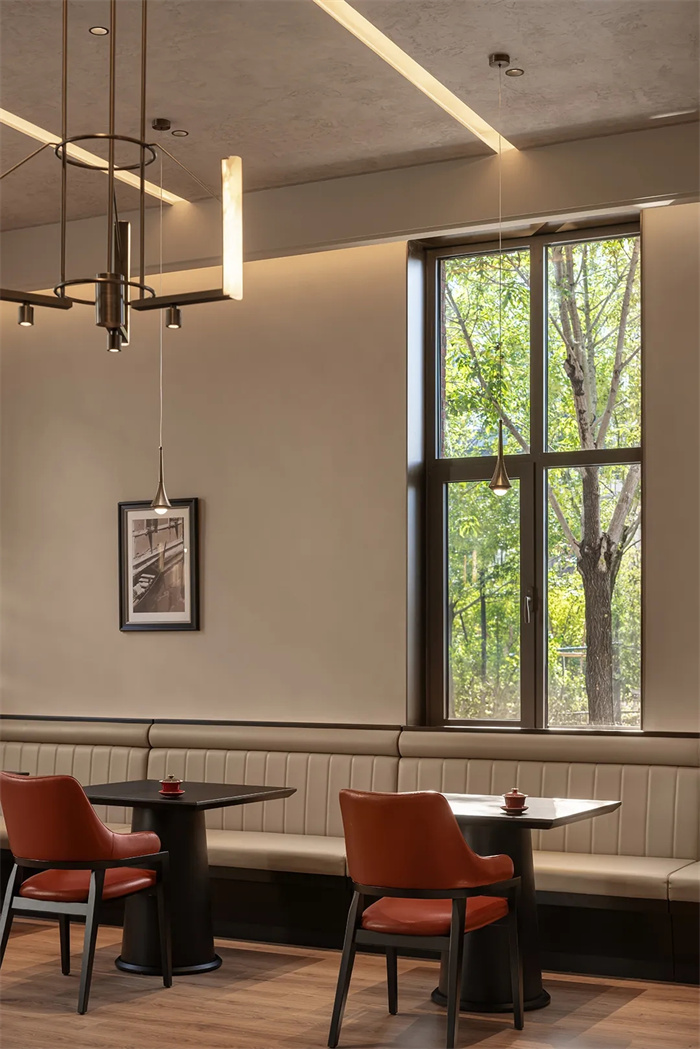 窗戶將戶外自然納入室內(nèi),透過窗欞灑落的斑駁光影,綠植與戶外景觀的遙相呼應(yīng),形成一個休閑、隨性、愉悅的用餐情境。中餐廳設(shè)計并非一成不變的場所,其延伸價值在于觀者踏入并產(chǎn)生互動所具備的多樣性,從而形成不同的記憶與感知。