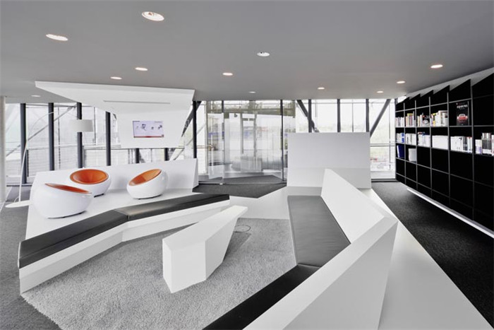 五樓緊鄰健身房的員工閱覽室,則以不規(guī)則的幾何造型,配以黑白灰,營造出極致凝練的時尚空間。開敞的落地玻璃,將室內(nèi)外風(fēng)景交匯融合,黑白的極致純凈在空間里鋪陳蔓延。