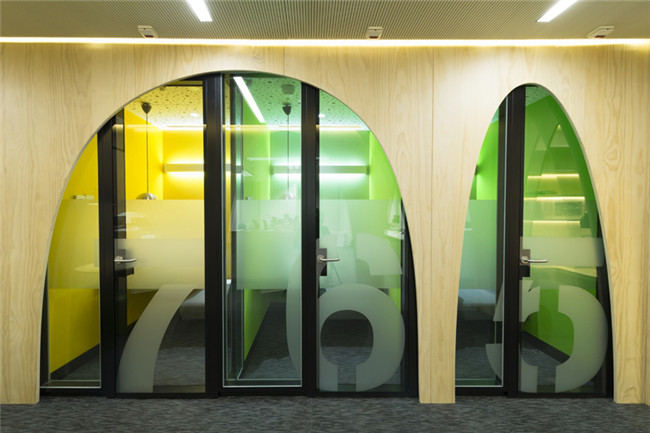 整間辦公室色彩使用十分明快,以白墻和木材質(zhì)為底,使用鮮艷的紅色、橙色、草綠、淡黃等顏色搭配,沉穩(wěn)中帶有一絲輕快、內(nèi)斂又不失活潑。讓人們的心情也頓時好了起來。此外,除了亮眼的拱形元素,室內(nèi)并沒有運用太多跳眼的裝飾手法,不至于讓人眼花繚亂。
