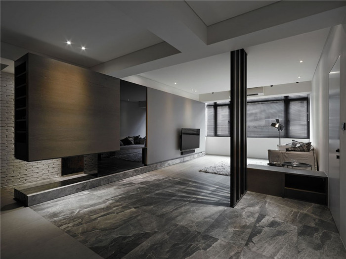 落地窗引入了自然光線,刻劃出每天的日升日落;人工光源穿過(guò)格柵拖曳出光的軌跡。佐以木皮、磚墻、石板、鐵件呈現(xiàn)出的低彩色調(diào)綜感,讓人有空間放大的錯(cuò)覺(jué)。